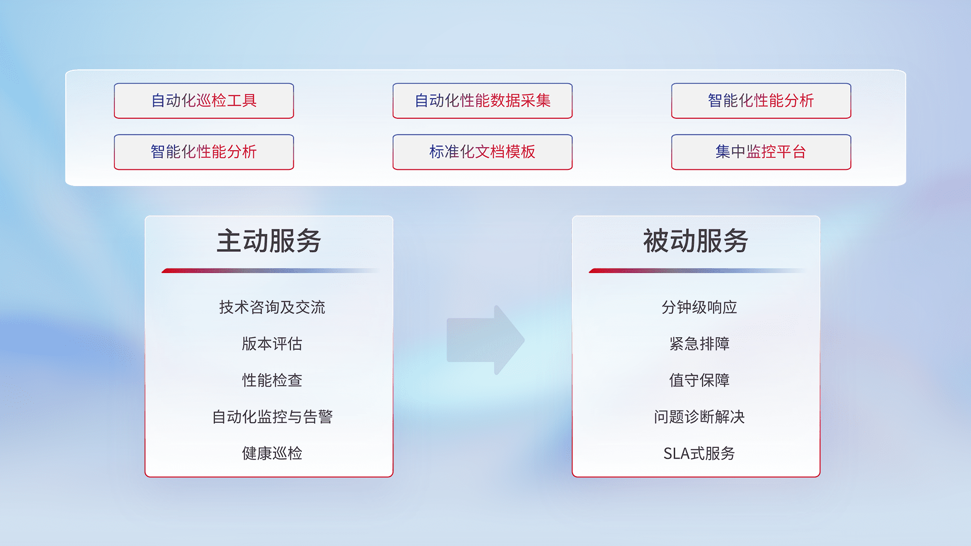 智能化工具和标准化文档,,,,保障服务质量,,,,提供主动服务(包含技术咨询、、版本评估、、、性能检查、、、自动化监控与告警、、健康巡检)和被动服务包含(分钟级响应、、、紧急排障、、、、值守保障、、、问题诊断解决、、SLA服务)。。